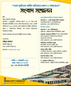 রোড সেফটি ফাউন্ডেশন আগামীকাল ৮ জানুয়ারি ২০২২ শনিবার সকাল সাড়ে ১০টায় ঢাকা রিপোর্টার্স ইউনিটি’র সাগর-রুনি মিলনায়তনে “২০২১ সালের সড়ক দুর্ঘটনার বার্ষিক প্রতিবেদন প্রকাশ ও পর্যালোচনা” বিষয়ক এক সংবাদ সম্মেলনের আয়োজন করেছে।