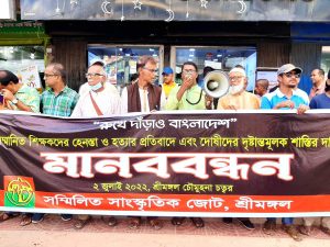 অাজ শনিবার (২ জুলাই ২০২২) শ্রীমঙ্গল চৌমুহনা চত্বরে সম্মিলিত সাংস্কৃতিক জোটের উদ্যোগে এ মানববন্ধন অনুষ্ঠিত হয়।
