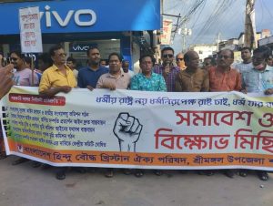 নিজস্ব প্রতিবেদক | শ্রীমঙ্গল (মৌলভীবাজার), ১৬ জুলাই ২০২২ : সংখ্যালঘু সুরক্ষা আইন প্রণয়ন ও জাতীয় সংখ্যালঘু কমিশন গঠন, বৈষম্য বিলোপ আইন প্রণয়ন, অর্পিত সম্পত্তি প্রত্যার্পন অাইন দ্রুত বাস্তবায়ন,পার্বত্য শান্তি চুক্তি ও পার্বত্য ভূমি কমিশন অাইনের যথাযথ বাস্তবায়ন, সমতলের অাদিবাসীদের জন্যে পৃথক ভূমি কমিশন গঠন, দেবোত্তর সম্পত্তি সংরক্ষণ আইন প্রণয়নের দাবিতে শ্রীমঙ্গলে বিক্ষোভ মিছিল ও সমাবেশ করেছে বাংলাদেশ হিন্দু বৌদ্ধ খ্রিষ্টান ঐক্য পরিষদ।