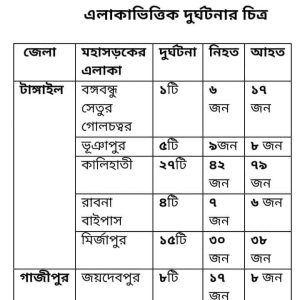মহাসড়কের এলাকাভিত্তিক দুর্ঘটনা পর্যবেক্ষণে দেখা যায়, টাঙ্গাইল জেলায়- বঙ্গবন্ধু সেতুর গোলচত্বরে ১টি দুর্ঘটনায় ৬ জন নিহত, ১৭ জন আহত, ভূঞাপুরে ৫টি দুর্ঘটনায় ৯জন নিহত, ৮ জন আহত, কালিহাতীতে ২৭টি দুর্ঘটনায় ৪২ জন নিহত, ৭৯ জন আহত, রাবনা বাইপাসে ৪টি দুর্ঘটনায় ৭ জন নিহত, ৬ জন আহত, মির্জাপুরে ১৫টি দুর্ঘটনায় ৩০ জন নিহত ও ৩৮ জন আহত হয়েছে।