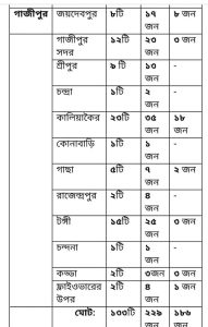 গাজীপুর জেলায়- জয়দেবপুরে ৮টি দুর্ঘটনায় ১৭ জন নিহত, ৮ জন আহত, গাজীপুর সদরে ১২টি দুর্ঘটনায় ২৩ জন নিহত, ৩ জন আহত, শ্রীপুরে ৯টি দুর্ঘটনায় ১৩ জন নিহত, চন্দ্রায় ১টি দুর্ঘটনায় ২ জন নিহত, কালিয়াকৈরে ২৩টি দুর্ঘটনায় ৩৫ জন নিহত, ১৮ জন আহত, কোনাবাড়িতে ১টি দুর্ঘটনায় ১ জন নিহত, গাছায় ৫টি দুর্ঘটনায় ৭ জন নিহত, ২ জন আহত, রাজেন্দ্রপুরে ২টি দুর্ঘটনায় ৪ জন নিহত, টঙ্গীতে ১৫টি দুর্ঘটনায় ২৫ জন নিহত, ৩ জন আহত, চন্দনায় ১টি দুর্ঘটনায় ১ জন নিহত, কড্ডায় ২টি দুর্ঘটনায় ৩ জন নিহত, ৩জন আহত ও ফ্লাইওভারের উপরে ২টি দুর্ঘটনায় ৪ জন নিহত ও ১ জন আহত হয়েছে।