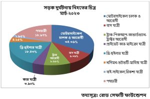 ফেব্রুয়ারি মাসে সড়ক দুর্ঘটনায় নিহত হয়েছিল ৪৮৭ জন, অর্থাৎ গড়ে প্রতিদিন নিহত হয়েছিল ১৭.৩৯ জন। মার্চে গড়ে প্রতিদিন নিহত হয়েছে ১৮.১৯ জন। এই হিসাবে মার্চ মাসে প্রাণহানি বেড়েছে ৪.৬০%। মার্চে সড়ক দুর্ঘটনায় ১৮ থেকে ৬৫ বছর বয়সী কর্মক্ষম মানুষ নিহত হয়েছেন ৪৬৬ জন, অর্থাৎ ৮২.৬২ শতাংশ।