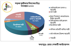 বিশেষ প্রতিনিধি | ঢাকা, ০৯ ডিসেম্বর ২০২৩ : গত নভেম্বর মাসে দেশে ৫৪১টি সড়ক দুর্ঘটনায় নিহত ৪৬৭ জন এবং আহত ৬৭২ জন। নিহতের মধ্যে নারী ৫৩, শিশু ৬৬। ২০৭টি মোটরসাইকেল দুর্ঘটনায় নিহত ১৮১ জন, যা মোট নিহতের ৩৮.৭৫ শতাংশ। মোটরসাইকেল দুর্ঘটনার হার ৩৮.২৬ শতাংশ। দুর্ঘটনায় ১০৬ জন পথচারী নিহত হয়েছে, যা মোট নিহতের ২২.৬৯ শতাংশ। যানবাহনের চালক ও সহকারী নিহত হয়েছেন ৬৮ জন, অর্থাৎ ১৪.৫৬ শতাংশ।