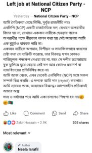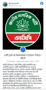 এনসিপি (NCP) একটি রাজনৈতিক দল, যেখানে অপরাধীর বিচার হয় না, যেখানে একজন নারীকে হেনস্তার পরেও অপরাধীর পক্ষে নীরবতা পালন করা হয় সেই জায়গায় আমি এক মুহূর্তও থাকতে পারি না।