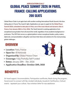 বিশেষ প্রতিনিধি | প্যারিস (ফ্রান্স), ২৫ অক্টোবর ২০২৫ : বিশ্ব শান্তি ও টেকসই উন্নয়নের লক্ষ্যে আন্তর্জাতিক তরুণ নেতাদের এক মঞ্চে আনতে আবারও আয়োজন করা হচ্ছে গ্লোবাল পিস সামিট ২০২৬ (Global Peace Summit 2026)। এ বছরের সম্মেলনটি অনুষ্ঠিত হবে ফ্রান্সের রাজধানী প্যারিসে, আগামী ২৮ জানুয়ারি থেকে ৩১ জানুয়ারি, ২০২৬ পর্যন্ত।